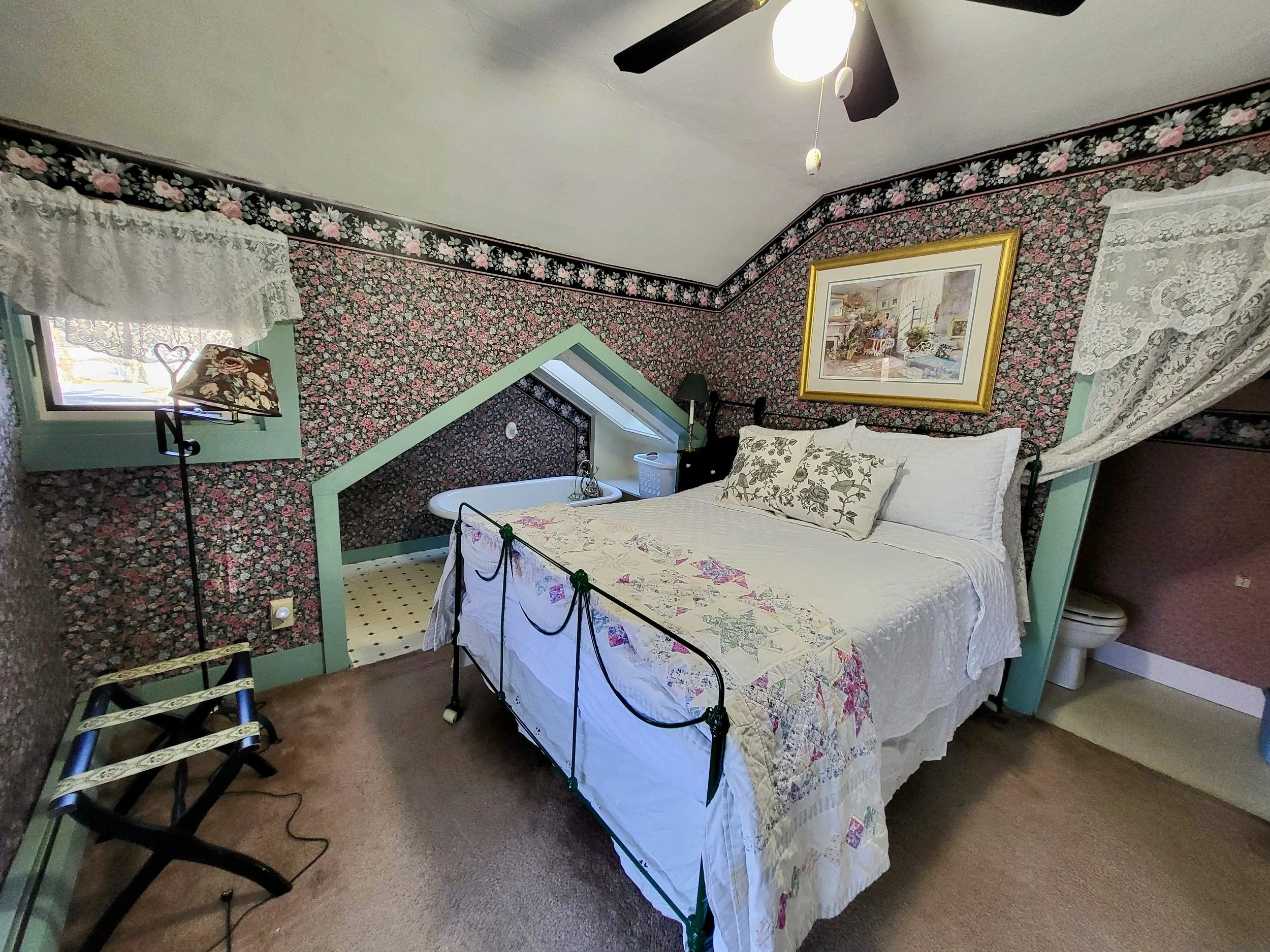 The Salon is a storybook room. Surround yourself with flowers and lace. Snuggle into this full brass bed and create your own vacation stories.