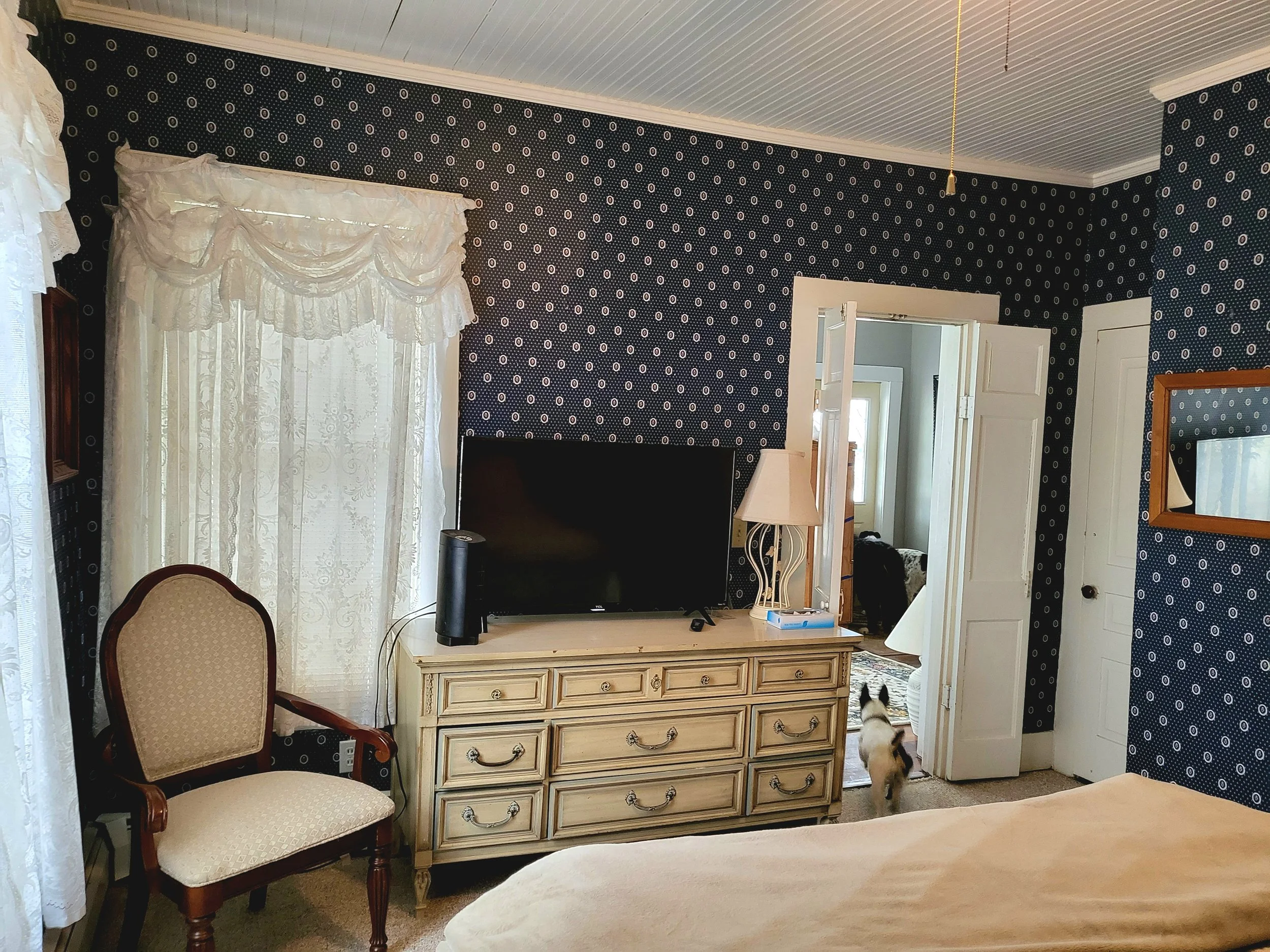 Located on the first floor, the Victorian room is the in the original house. With a queen bed, and a poetic atmosphere, you can imagine yourself in days gone by. Perfect for an older person, or a couple that wants some privacy. This is also the only room that has its own television.